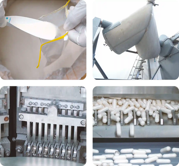The blend goes into our precision-pin style encapsulator to fill the powder into acid-resistant vegetable capsules