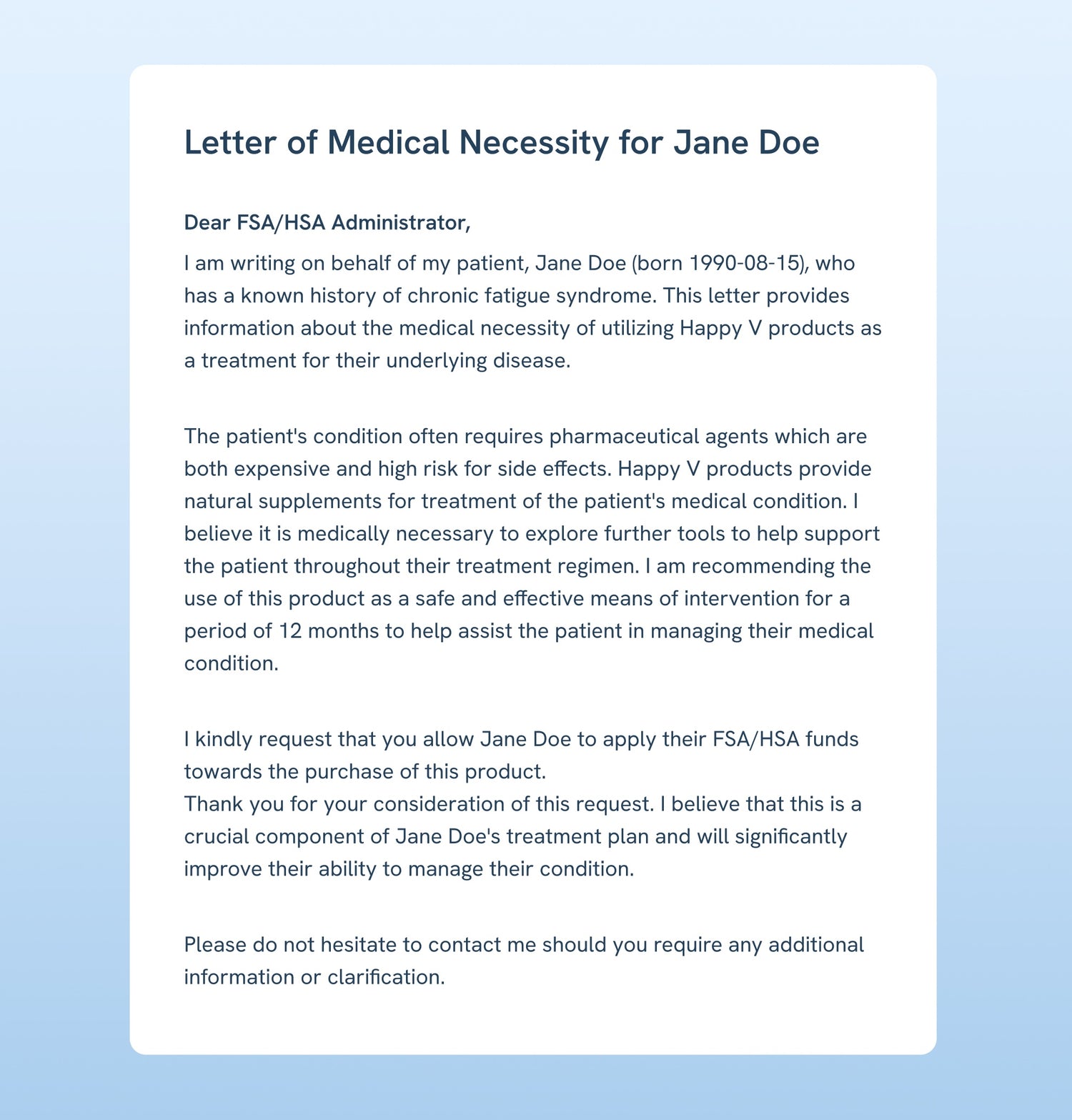 The IRS oversees HSA and FSA eligibility and dictates that a customer must have a medical condition or disease that they are seeking to treat or manage with Happy V supplements. Customers must have documentation that confirms their eligibility, also called a Letter of Medical Necessity. Not to worry, Happy V has partnered with Flex to make this a quick and easy process for customers.