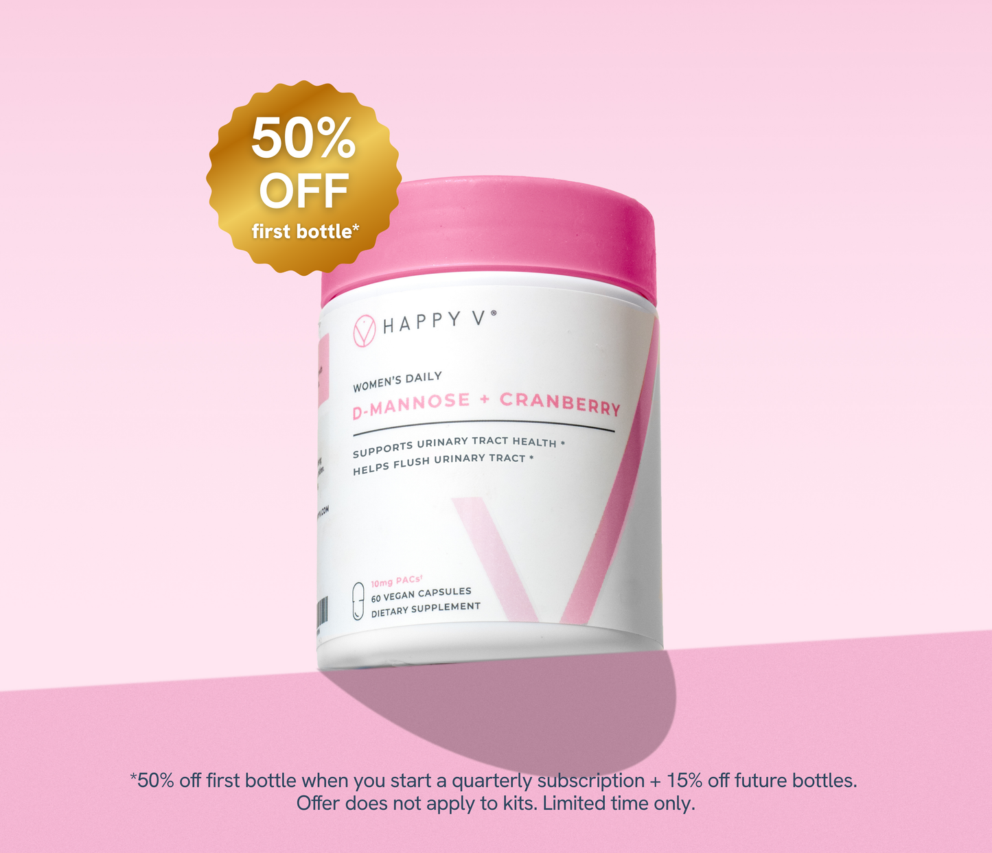 Our Happy V® D-Mannose + Cranberry was created for anyone who wants to improve their Urinary Health. Eliminate the pain, burning sensation, constant need to urinate and vaginal irritation.