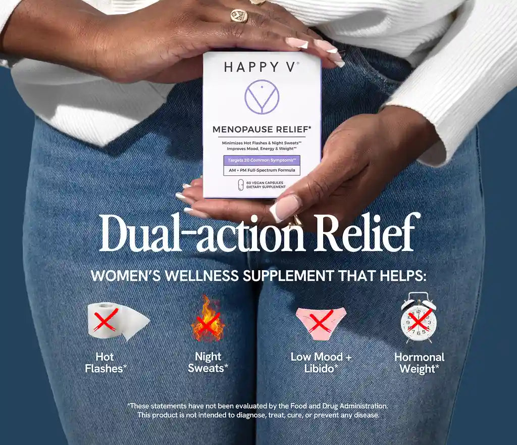 How does Happy V®’s Menopause Relief help with hot flashes and night sweats?